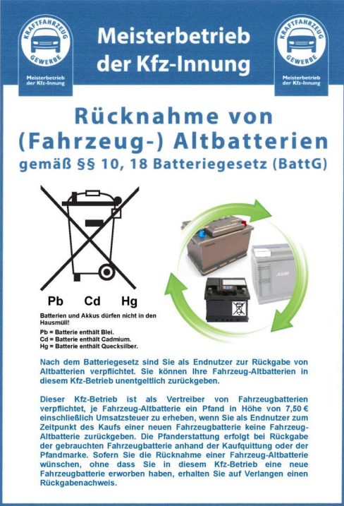 Rücknahme von (Fahrzeug-) Altbatterien Nach dem Batteriegesetz sind Endnutzer zur Rückgabe von Altbatterien berechtigt. Altbatterien können an der Verkaufsstelle (z.B. Kfz-Betrieb) unentgeltlich zurückgegeben werden. Sie sind als Vertreiber von Fahrzeugbatterien verpflichtet, je Fahrzeugbatterie ein Pfand von 7,50 € einschließlich Umsatzsteuer zu erheben, falls Endnutzer beim Kauf einer neuen Fahrzeugbatterie keine Fahrzeug-Altbatterie zurückgeben. Die Pfanderstattung erfolgt bei Rückgabe der gebrauchten Fahrzeugbatterie gegen Vorlage der Kaufquittung oder der Pfandmarke.