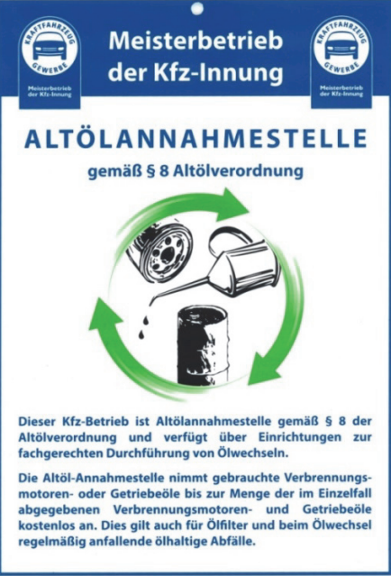 Sie verkaufen Verbrennungsmotoren- oder Getriebeöle an Ihre Kunden? Dann sind auch Sie verpflichtet, eine Altölannahmestelle einzurichten. Wir haben für Sie, als Meisterbetrieb der Kfz-Innung Schwaben, ein einheitliches Schild produziert. Hier weisen Sie Ihren Kunden darauf hin, dass Sie beim Ölwechsel neben der fachgerechten Durchführung von Ölwechseln auch die fachgerechte Entsorgung des Altöles übernehmen. Nutzen Sie diese Gelegenheit und machen Sie für 6,90 € auf sich und die Kompetenz Ihres Betriebs aufmerksam.