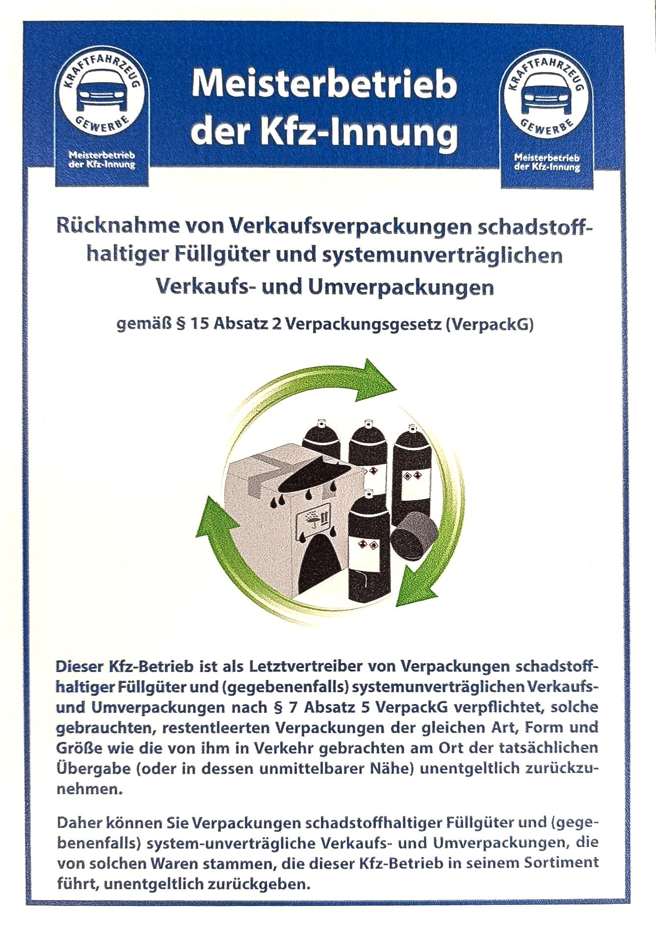 Die Rücknahme von Verkaufs- und Umverpackungen ist ein wichtiger Aspekt des Umweltschutzes und der Ressourcenschonung. In Deutschland regelt das Verpackungsgesetz die Pflichten von Herstellern und Händlern bei der Rücknahme und Verwertung von Verpackungen. Wir haben für Sie, als Meisterbetrieb der Kfz-Innung Schwaben, ein einheitliches Schild produziert, mit dem Sie Ihre Kunden darauf hinweisen können.