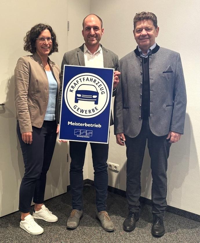 Ein Vorstandsmitglied bekommt ein Meisterschild? Genau, denn das Autohaus Sirch hat in Kaufbeuren einen neuen Standort eröffnet, welcher seit Oktober 2024 neues Mitglied ist. Geschäftsführerin Petra Brandl und Obermeister Alois Huber nutzten kürzlich die Gelegenheit in der Kfz-Innung, das Meisterschild persönlich an Geschäftsführer Tobias Sirch zu übergeben.